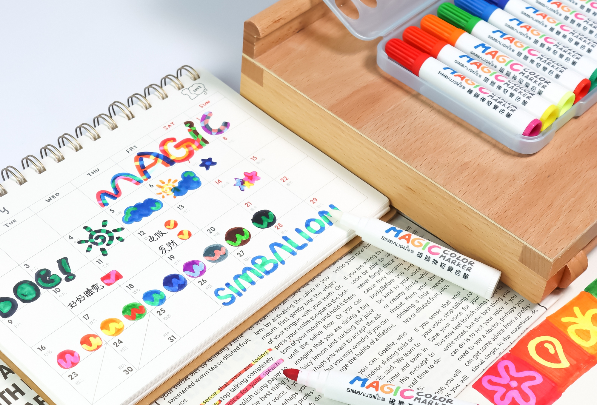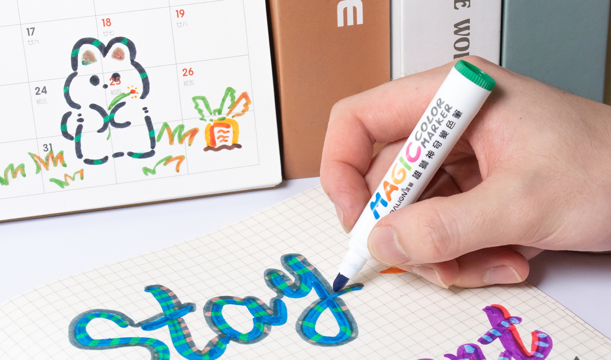 雄狮神奇变色笔不仅是孩子的创意玩伴,更成为家庭亲子互动的全新纽带,也为 DIY 爱好者解锁了多元创作可能。周末午后,妈妈和女儿一起制作手账。她们先用黑色笔写下“生日快乐”,再用白色变色笔在字迹上描边——黑色竟变成了浪漫的红色!女儿兴奋地拍手:“妈妈,我们是不是在施法?”妈妈笑着点头,心中却感慨:这支笔不仅带来了欢笑,更让她重新找回陪伴孩子创作的纯粹时光。而在DIY爱好者手中,神奇变色笔则化身解谜游戏的道具。有人设计“隐形地图”,只有用特定彩笔覆盖才能显形;有人制作节日贺卡,收礼人需用白笔“解锁”隐藏祝福。这种可定制的互动性,让一张纸、一支笔,也能承载无限叙事可能。