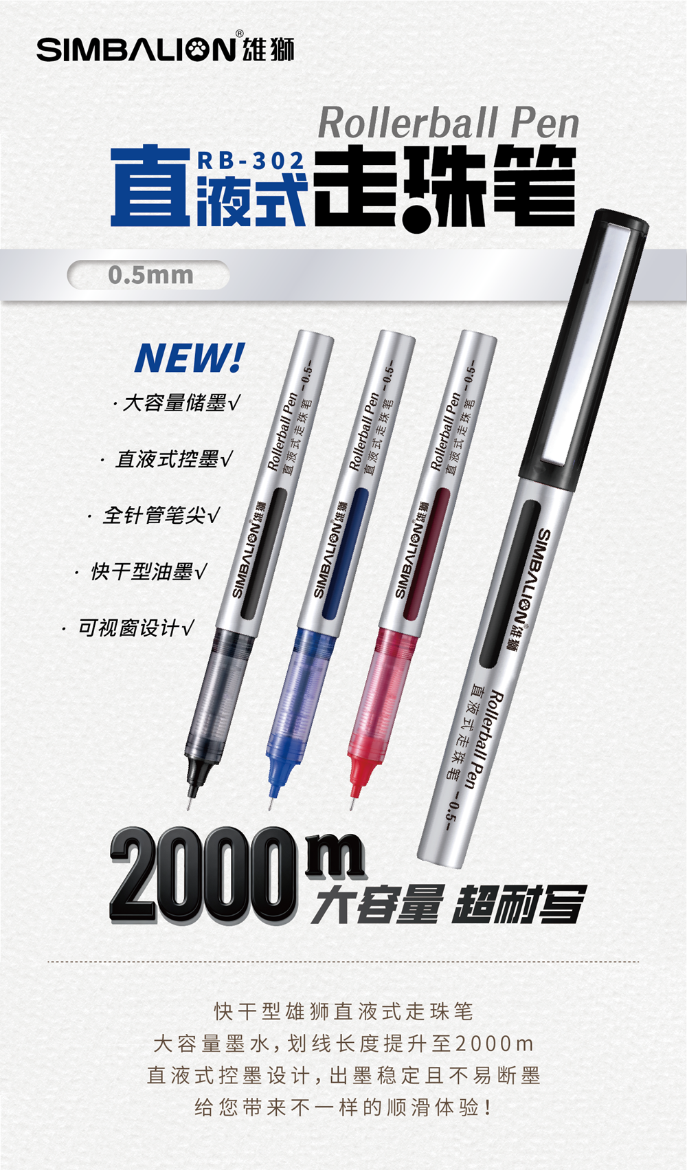 雄狮直液式走珠笔,拥有超长2000m使用长度,刷题 / 记笔记不怕断墨!直液式出墨均匀,快干不蹭手