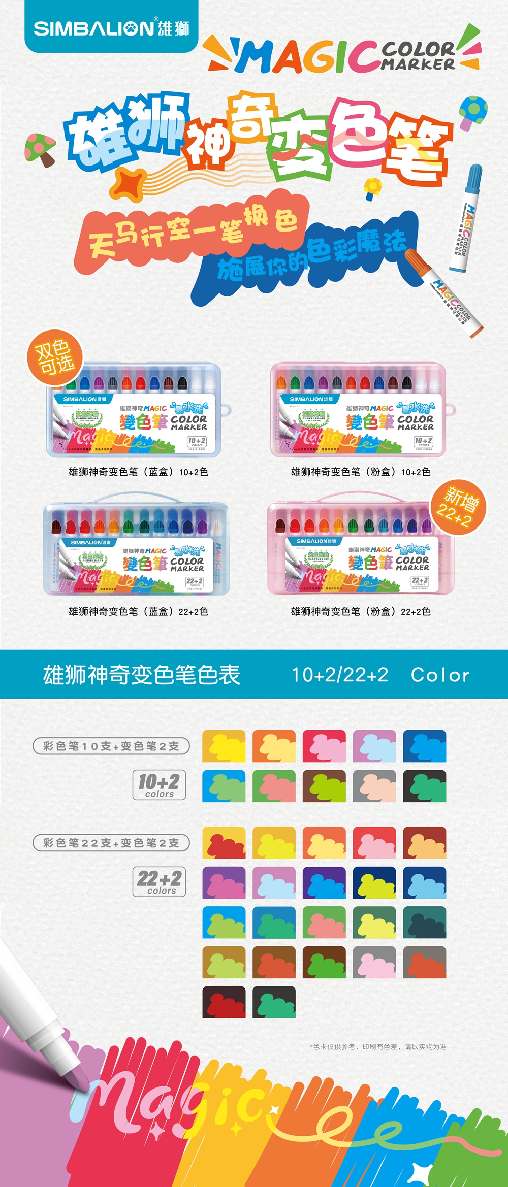 雄狮神奇变色笔,通过神奇变色效果,天马行空一笔换色,施展你的色彩魔法,整组共24支包括,22支彩色笔,2支变色笔。适合涂鸦、点缀笔记、花边手账、DIY等用途,探索神奇色彩,激发无限创意!